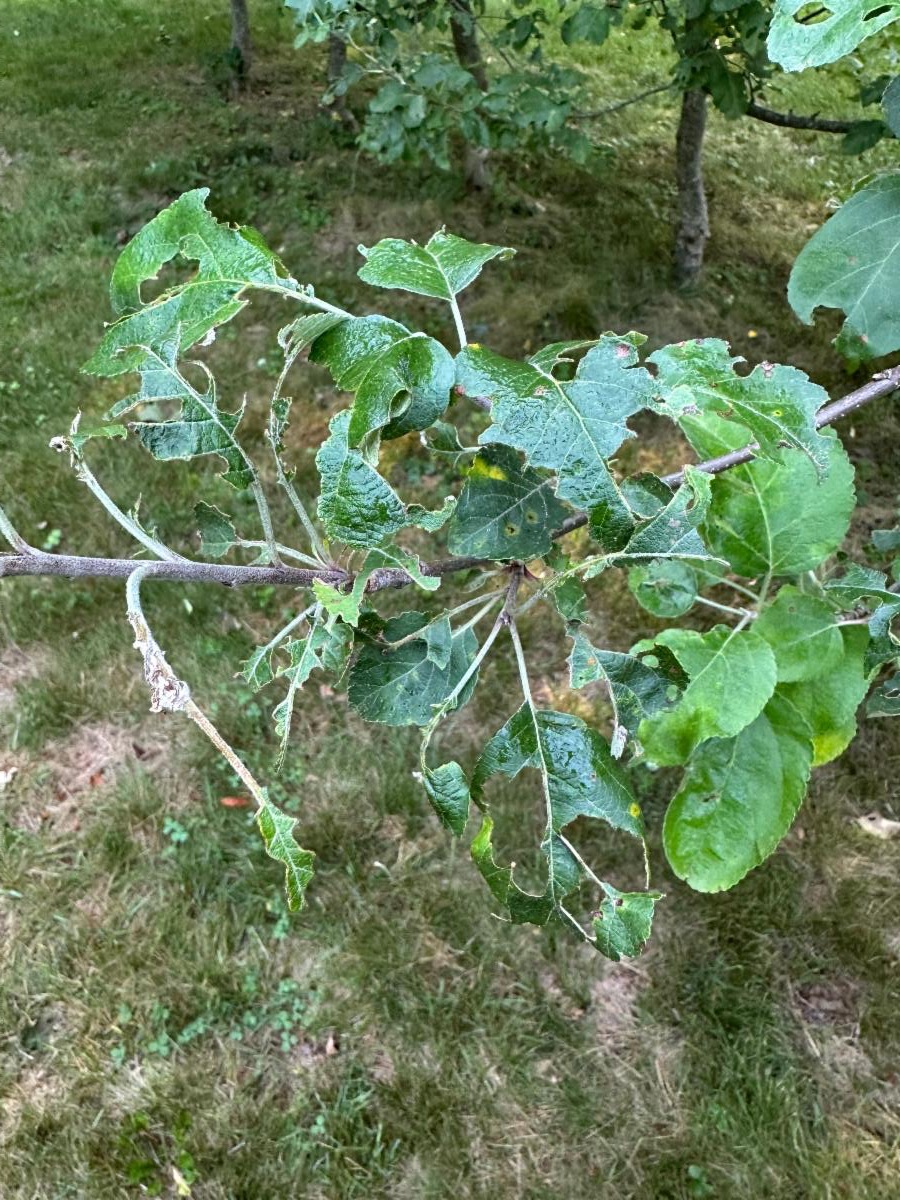 | | Skeletonized leaves on apple tree from larvae. | | |