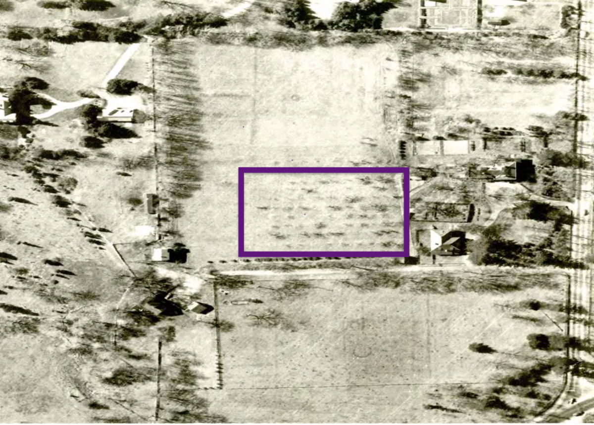 | Arial photograph of the orchard around 1950. | | Arial photograph of the orchard around 1980. | | |