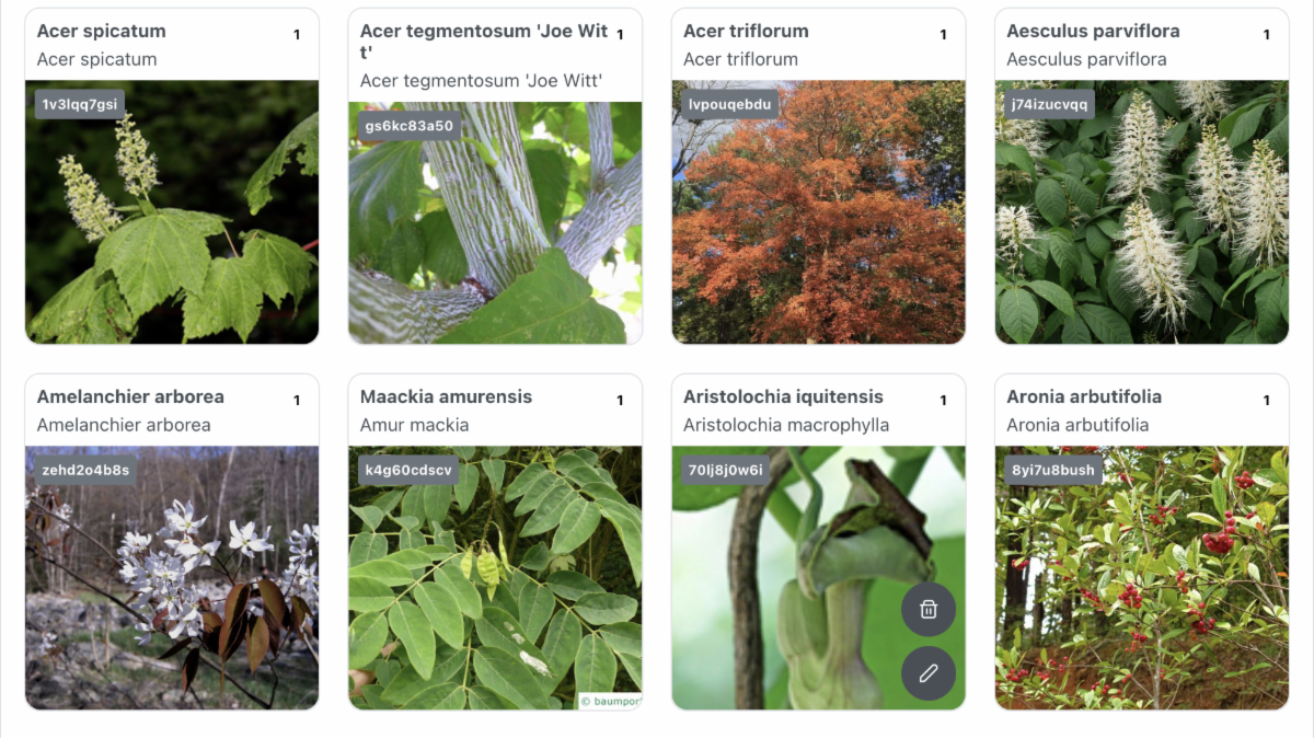 For the past few years the staff have used Plantsoon, formerly known as PlantsMaps, an accession tool used to monitor and track all of the plants in the collection. Several features are essential when selecting an accession method. The platform must be able to keep track of the latin name, common name, cultivar, location of the plant at the arboretum, and contain series of photographs. These features are not only informative for the arboretum's records, but also can be used by visitors to familiarize themselves with the arboretum and collection.