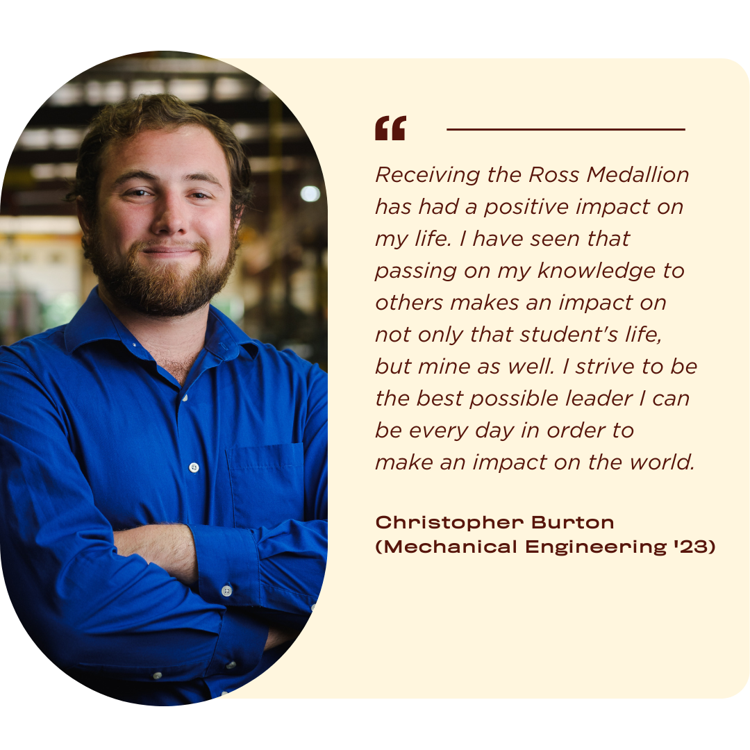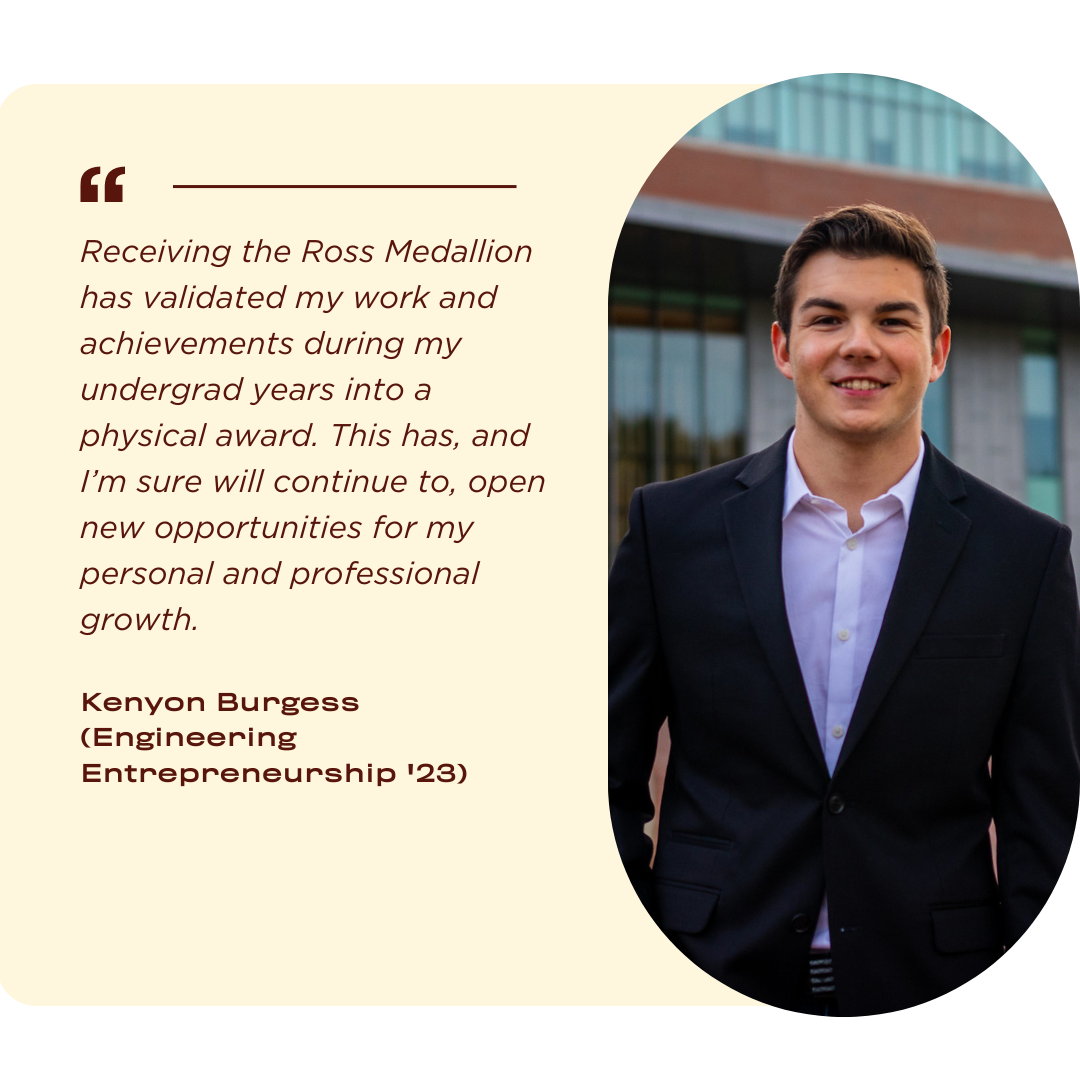 The 2023 Ross Medallion Award for Entrepreneurial Engagement recipients are Kenyon Burgess (Engineering Entrepreneurship '23) and Christopher Burton (Mechanical Engineering '23).