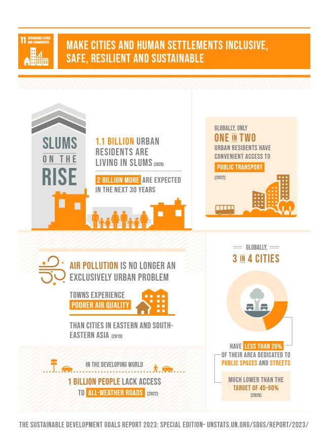 As the world’s urban population continues to grow, with 70% expected to live in cities by 2050, many cities struggle to keep up with rapid urbanization. In 2020, 1.1 billion people lived in slums, and this number is expected to rise by 2 billion in the next 30 years. Urban sprawl, pollution, and lack of public spaces are persistent issues. While progress has been made since the SDGs were implemented in 2015, challenges remain. Only half of the urban population had access to public transport in 2022. Sustainable urban development is essential for achieving these goals