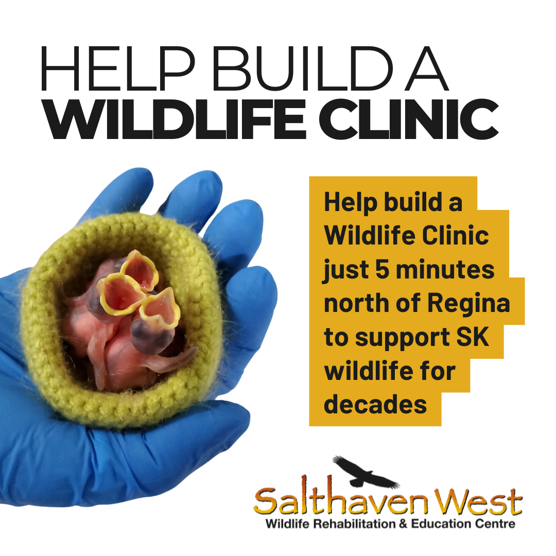 But they need our help. The current 600 sq/ft clinic that they have been operating out of for the past decade is no longer sufficient to meet the growing demand of their services. Salthaven West is fundraising to build an urgently needed Wildlife Rehabilitation Clinic so they can continue serving Saskatchewan communities and wildlife without interruption.