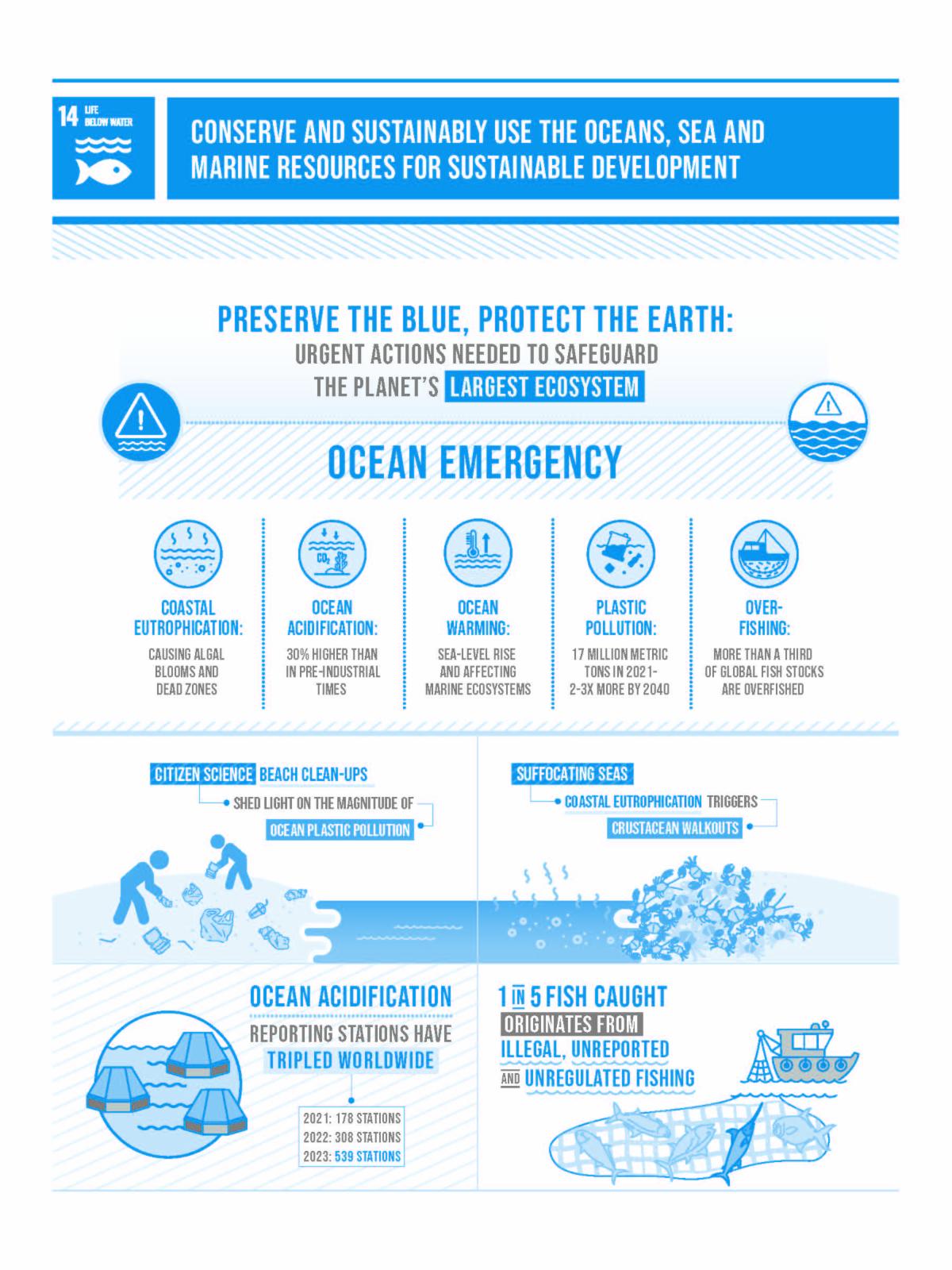 Goal 14 emphasizes the conservation and sustainable use of oceans, seas, and marine resources vital for life on Earth. Oceans cover 75% of the planet, house 97% of Earth's water, and account for 99% of living space by volume. They offer critical resources, regulate the climate, and act as carbon sinks. Yet, threats like marine pollution, plastic debris, and ocean acidification jeopardize ecosystems, biodiversity, and food security. Increased conservation efforts, global collaboration, such as the Biodiversity Beyond National Jurisdiction Agreement, and sustainable practices like reducing plastic use are essential. Locally, responsible consumption and ocean-friendly choices can help protect these ecosystems, ensuring a sustainable future for this indispensable resource and its role in supporting humanity.