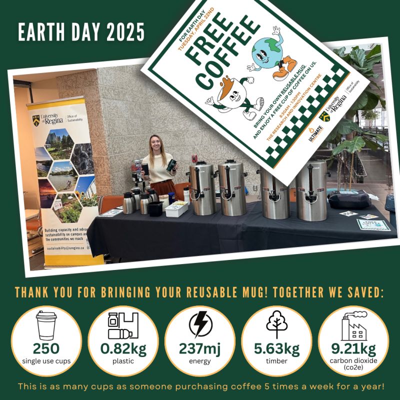 On Earth Day 2025, the University of Regina Sustainability Office partnered with Ultimate Rotisserie Experience to inspire eco-conscious behavior. Free coffee was offered to those bringing reusable mugs, saving 250 single-use cups from landfills. This initiative showcases collective action for sustainability, equivalent to a year's worth of cups for regular coffee drinkers. A small step with a big impact!