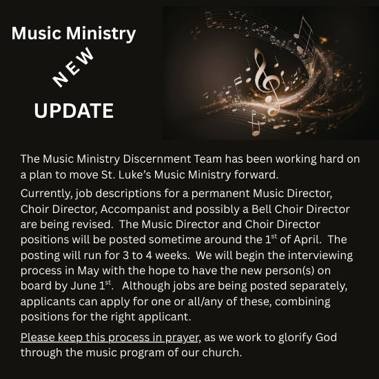 Just as a reminder: Checks for donations to Jeanne Miller MUST be made out to the Jeanne Miller Cancer Treatment Fund. They cannot be made out to St. Luke's as the church cannot be used as a pass through for funds. Checks may be given to John Euson (8:00 organist) or to the office who will give them to John or to Lynda Rowntree who attends the 10:00 service.