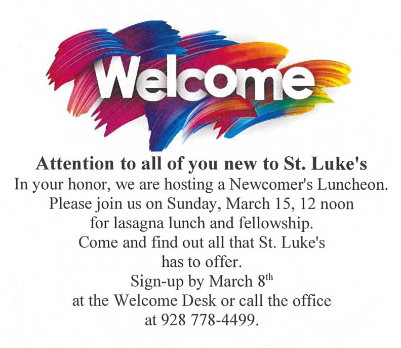 Our food donation program, which benefits three of our area food banks, continues. This has been an on-going program (separate from the St. Luke's Food Pantry) where parishioners can donate non-perishable food items that will in turn be shared with the Prescott Community Cupboard, the Prescott Valley Food Bank, and the Chino Valley Food Bank.