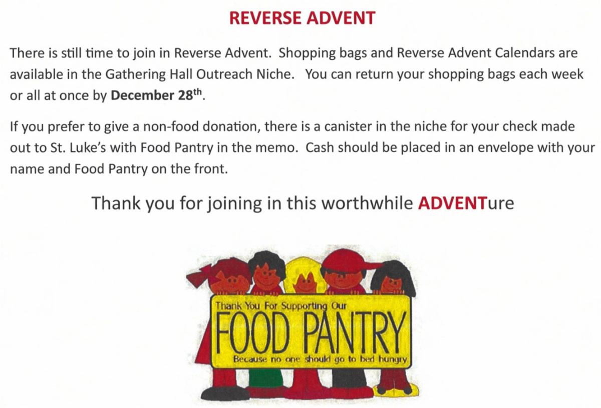 In the St. Luke's Outreach Cycle of Prayer – Don’t Spend Christmas Alone, Angel Tree, St. Luke’s Blood drive