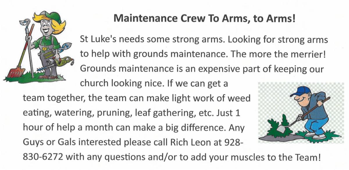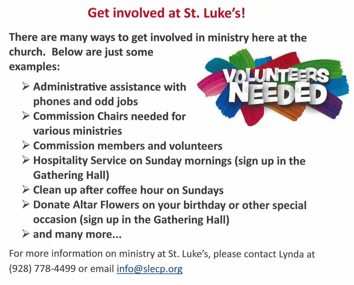 Let us give thanks to God our Father for all his gifts so freely bestowed upon us especially the abundance of creation, the many ministries at St. Luke’s and the volunteers that lead them, the continued growth of our church, those visiting St. Luke’s, and those returning.