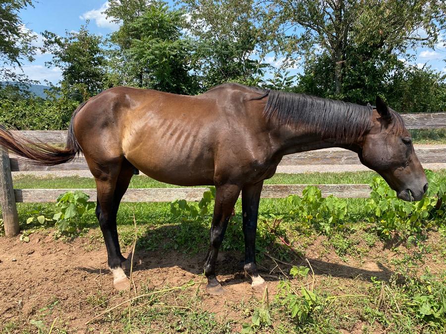 Equine Advocates will soon welcome a new resident to the sanctuary. On July 25th, we received a frantic call about a badly neglected 19-year-old Thoroughbred gelding who was awaiting the final ride of his life. He was about to be shipped from a Pennsylvania kill pen to a slaughterhouse in Mexico. Given the life and death emergency facing this poor guy, we agreed to provide “CJ” with a forever home here at the sanctuary. However, before that could happen, he had to first be moved from the kill pen to a quarantine facility where he will remain for a period of no less than 30 days. After that time, if it is determined by a veterinarian that he is free of any contagious diseases, we will transport him to Cornell University Hospital for Animals in Ithaca, NY where he will undergo a thorough examination and evaluation, including x-rays, so we will know exactly how to manage his care when he arrives at Equine Advocates. Barring any serious problems or complications, we expect him to arrive here in early September.