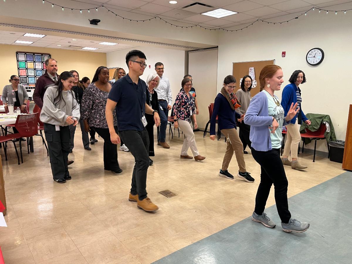 | | Photo: Nicole Groff PA-C (front, right) teaching Hunting Park staff traditional Cambodian and Papua line dances. | | | |