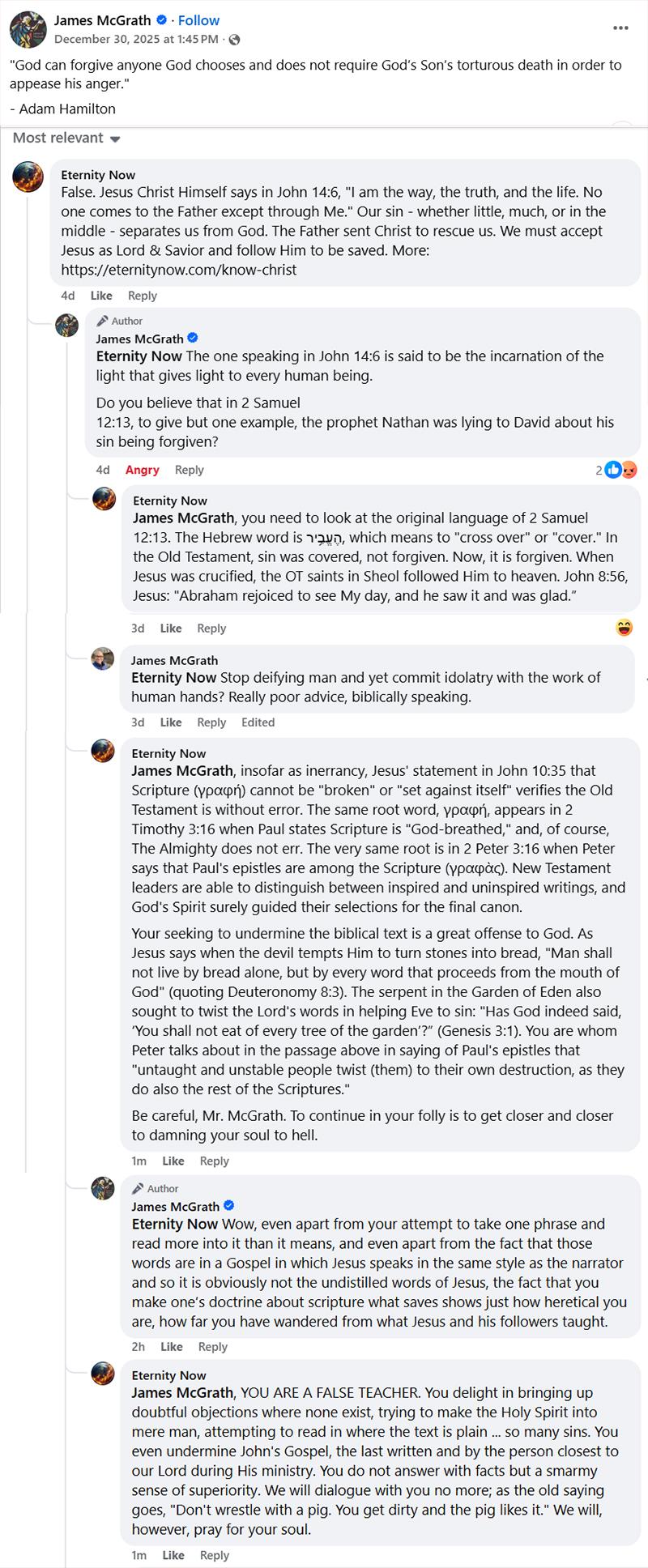 | | We stumbled across James McGrath, Ph.D., on Facebook when the platform said his posts may be of interest to Eternity Now. They were, for not only is McGrath the Clarence L. Goodwin Chair in New Testament Language and Literature at Butler University, he also is a grievous heretic. Butler is a private but nonreligious school charging 18-year-olds $61,850 a year to study under this loose thinking and heinous spirituality. | |