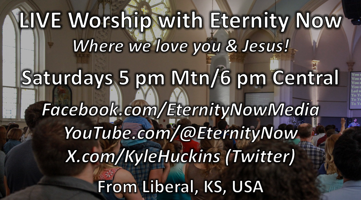 Saturdays 5 pm Mountain/6 pm Central: "Eternity Now Live Worship," with prayer, message, opportunity to receive Christ, and ministry updates