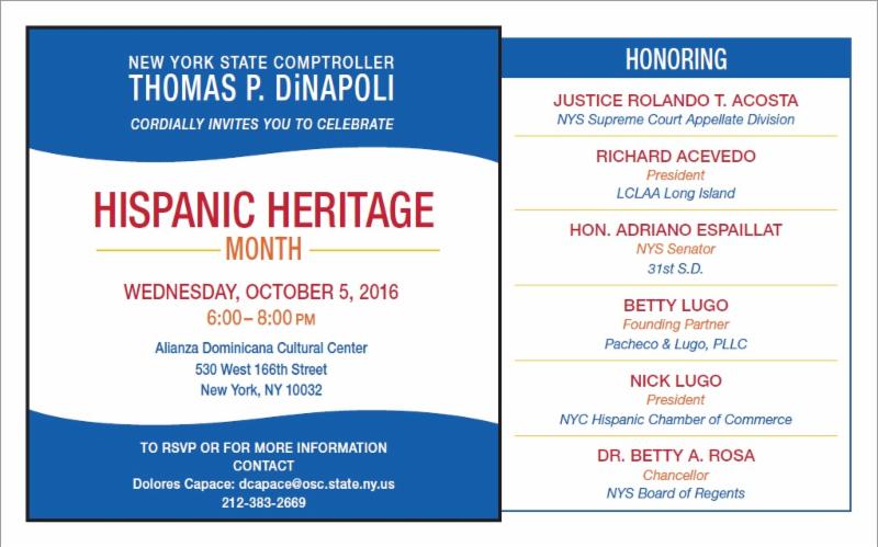 On Wednesday evening, please join me as our community hosts NYS Comptroller Tom DiNapoli for his annual Hispanic Heritage Month celebration. Comptroller DiNapoli will honor several of our community's own leaders including Senator Adriano Espaillat, Judge Rolando Acosta and NYS Board of Regents Chair Dr. Betty Rosa. This event will take place