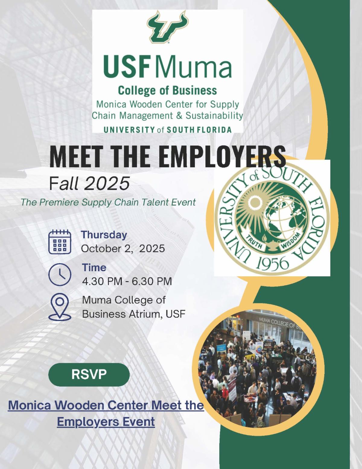 The USF Supply Chain Management & Sustainability Center invites partners to Meet the Employers on Thursday, October 2, 2025, from 4:30–6:30 PM at the Muma College of Business Atrium.