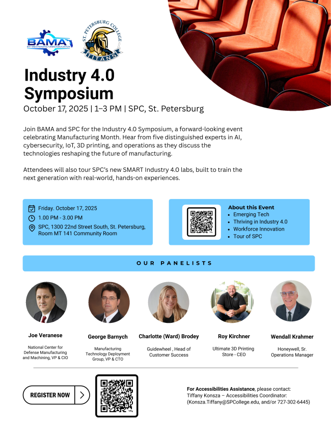 BAMA and St. Petersburg College are proud to host the Industry 4.0 Symposium on Friday, October 17, 2025, from 1:00–3:00 PM at SPC’s MT 141 Community Room in St. Petersburg, as part of Manufacturing Month.