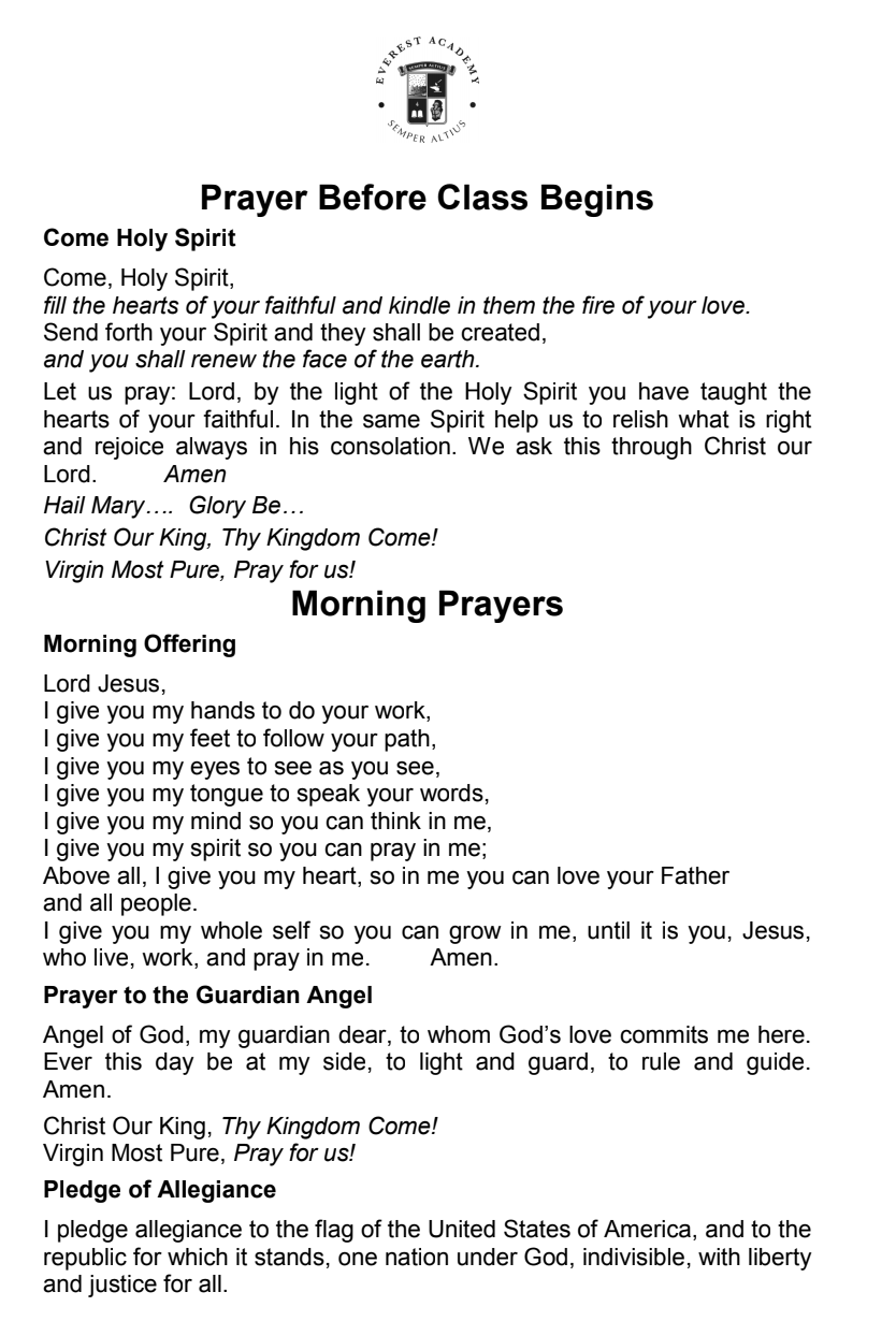 Prayer is an important part of our school day at Everest! We encourage families to continue these practices in their own homes and have included copies below.