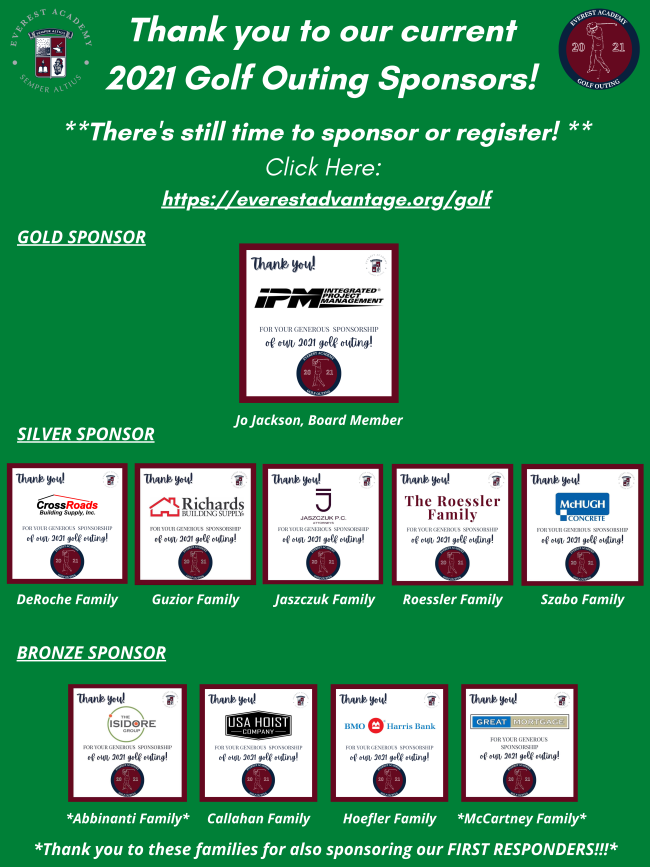 I would like to give a special thanks to Charisa Guzior, Mike LePore, Don McCartney, and Brett Szabo, the 2021 Everest Academy golf committee. The committee is working hard to create the first “normal” event since the pandemic.