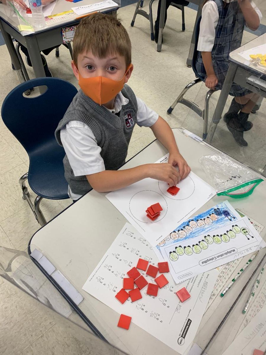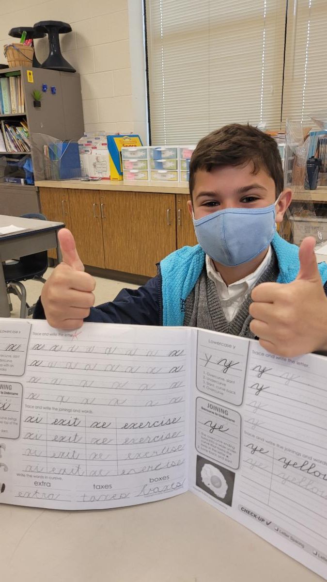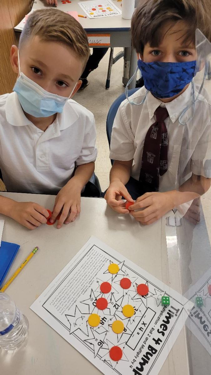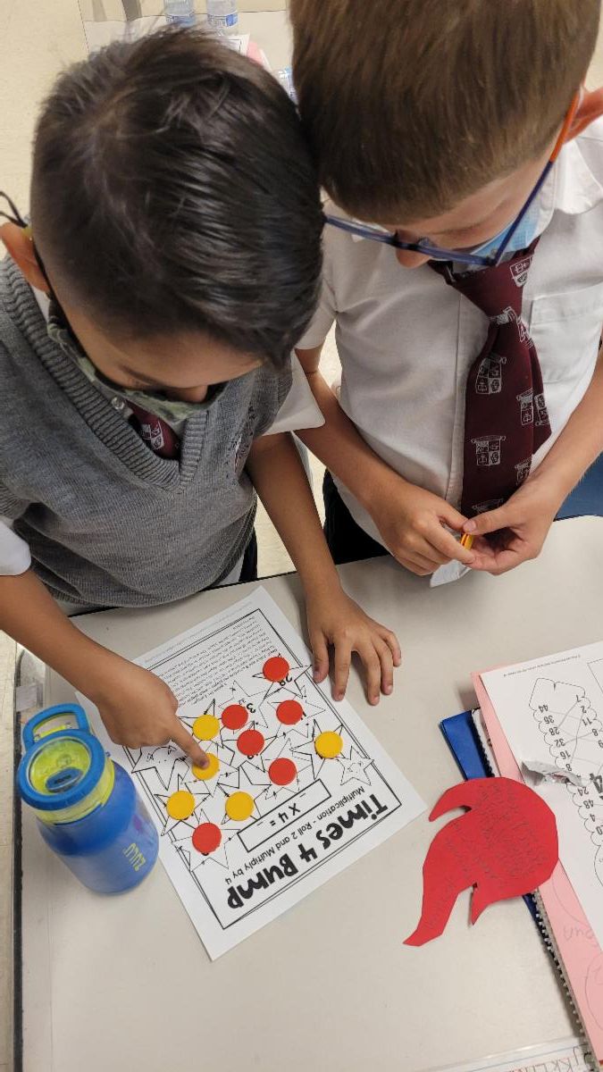 The 2nd graders are working on learning cursive lowercase letters and their x4 math facts with a partner game.