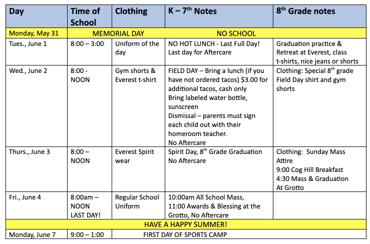 June 4 - NOON DISMISSAL- Last day of School for K-Gr. 7