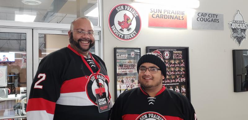 Staff members Mr. McKinney (left) and Mr. Turrubiartes (right) were recently recognized at a high school hockey game for staff appreciation. Each Hockey player selected a staff member that they wanted to recognize during the game. The player and the staff member walked across the ice together after the first period of the game.