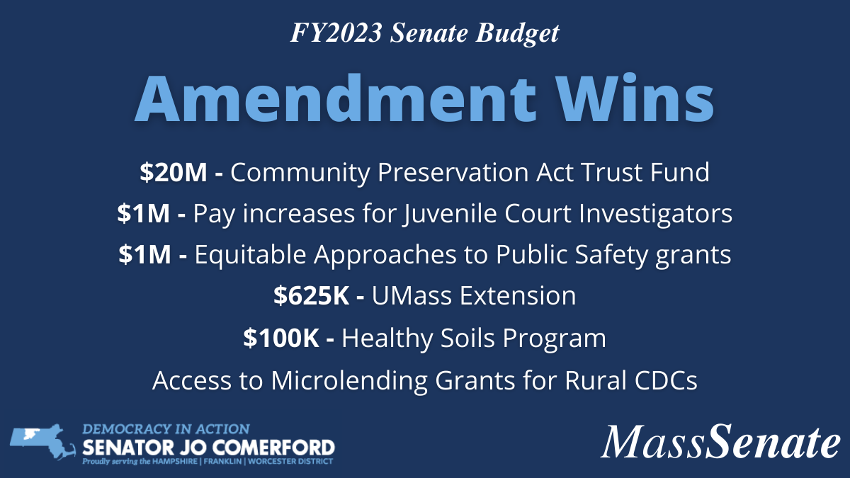 Amendment 834: Directs $20 million in surplus Fiscal Year 2022 revenue to the Community Preservation Act Trust Fund to be distributed to CPA Communities. I spoke to the importance of this Amendment here.