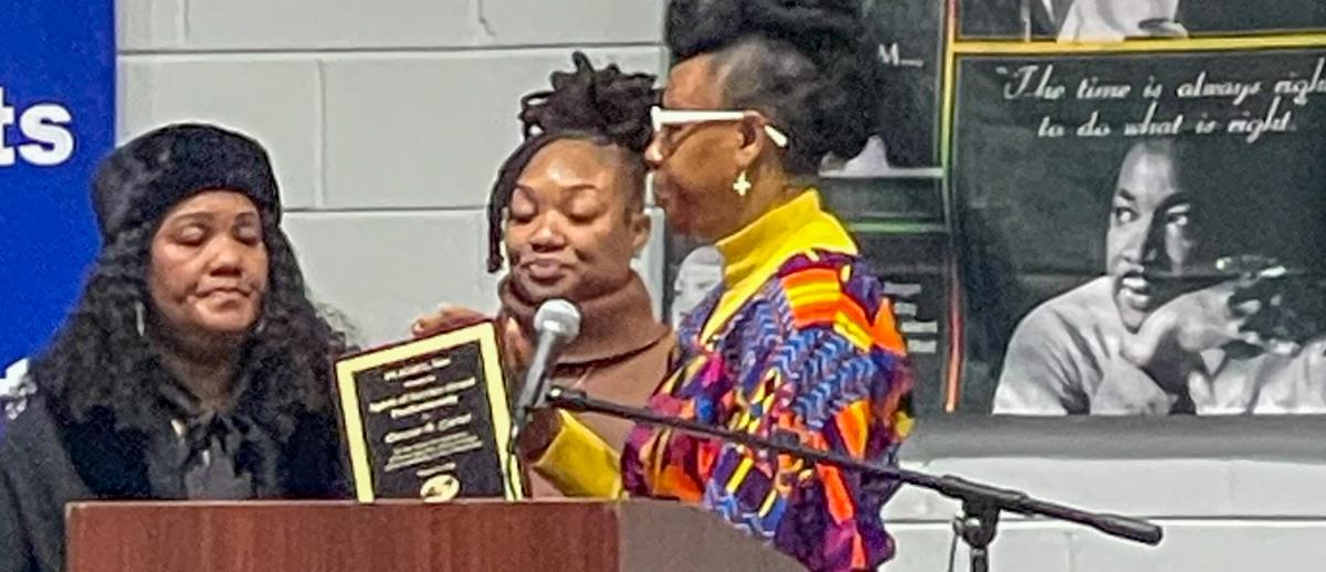 | | Kim Carter, left, the widow of Donnie B. Carter of Adel, accepts Plight of Georgia's Spirit of Service Award on behalf of her late husband during Monday's MLK Day breakfast in Tifton. Tift County Commissioner Melisa Hughes-Thomas, right, presents the award. | | MLK'S MESSAGE STILL RELEVANT, PASTOR TELLS TIFTON AUDIENCE | | |