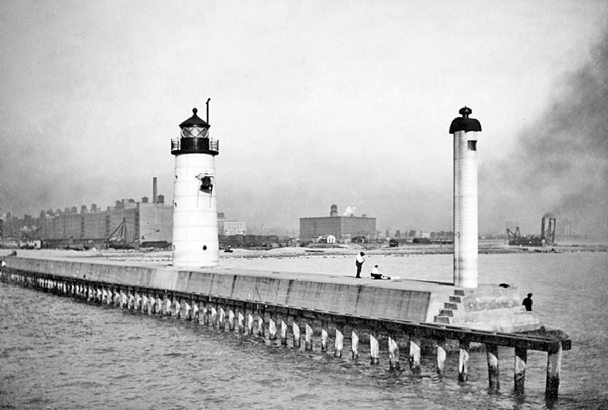 | 1914 Photo of Chicago's front (R) and rear (L)range lights marking the entrance to the Chicago River. Note Municipal Pier (now Navy Pier) under construction to the right of the front range light. (Source U.S. Coast Guard) | |
