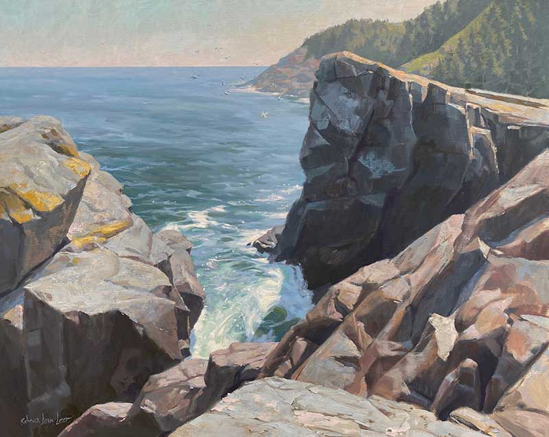 Although Leer paints all genres, the ocean calls, and she travels to Maine for rejuvenation through rock and sea.