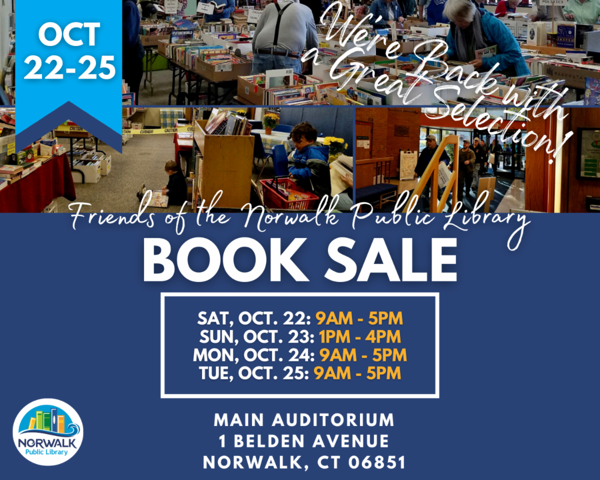 Friday, November 4, 2022 and Saturday, November 5, 2022. 10 am – 5 p m at Norwalk Public Library, in person. This will be our Sixth Annual Event. For more information contact Cynde Lahey at clahey@norwalkpl.org