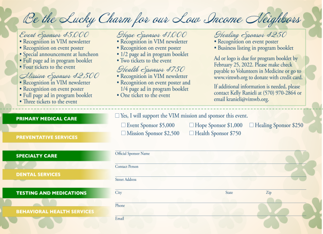 Volunteers in Medicine (VIM) is a community-based nonprofit organization established to provide primary & preventative medical, dental and behavioral health services to the working uninsured and underinsured populations in Northeastern Pennsylvania. Individuals receiving services, work with an income at or below 200% of the Federal Poverty Guidelines and have no access to affordable health insurance or medical care. All services are FREE and provided by an interprofessional team of staff and volunteers.