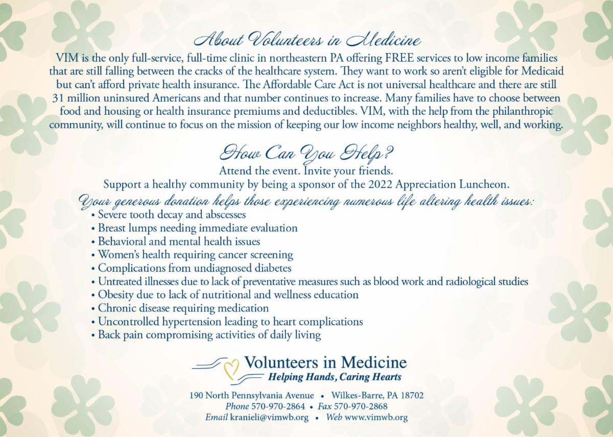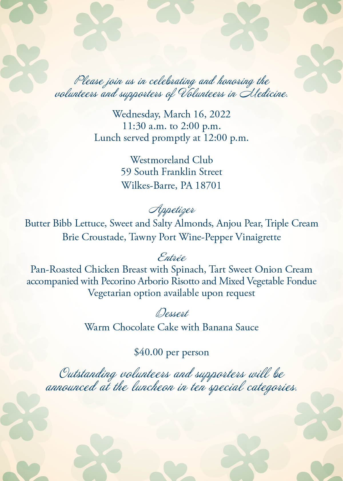 VIM will host its annual Appreciation Luncheon on March 16, 2022 at the Westmoreland Club located at 59 South Franklin Street, Wilkes-Barre, PA from 11:30am to 2:00pm.
