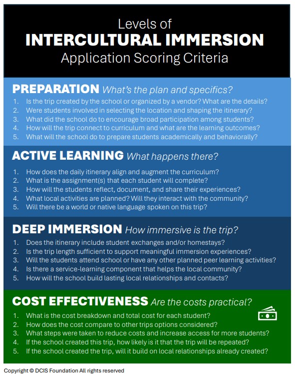 Your participation fuels our goals to give more students the chance to explore the world. Hey friends, let’s get more students traveling!  |  |    |   | SCHOLARSHIP DONATION STRATEGY |  |    |   | Often, donors are interested in learning how we evaluate scholarship applications from schools. Our chart below, entitled: Levels of INTERCULTURAL IMMERSION, guides schools, teachers, administrators, parents, students, and our mission — making our process transparent, clear, and fair.