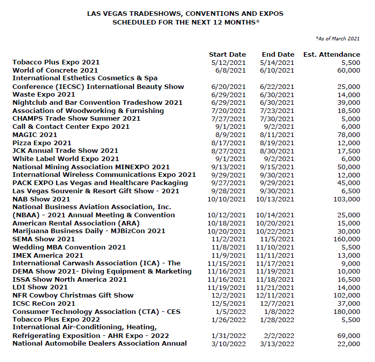 We are excited to share that, as Las Vegas re-opens for conventions and meetings, the following in-person shows (with historical attendance of 5,000+) are scheduled for the 2021 calendar year.