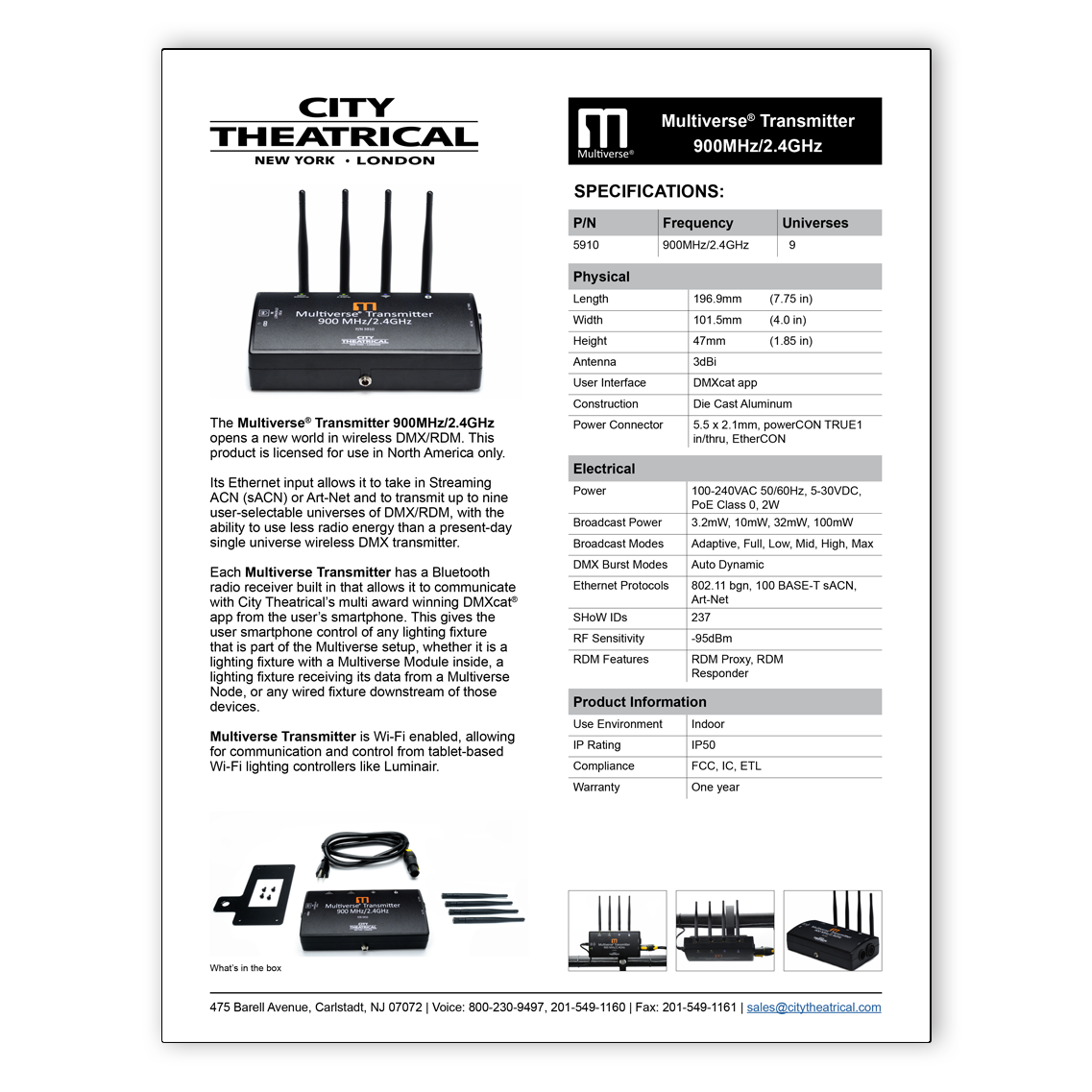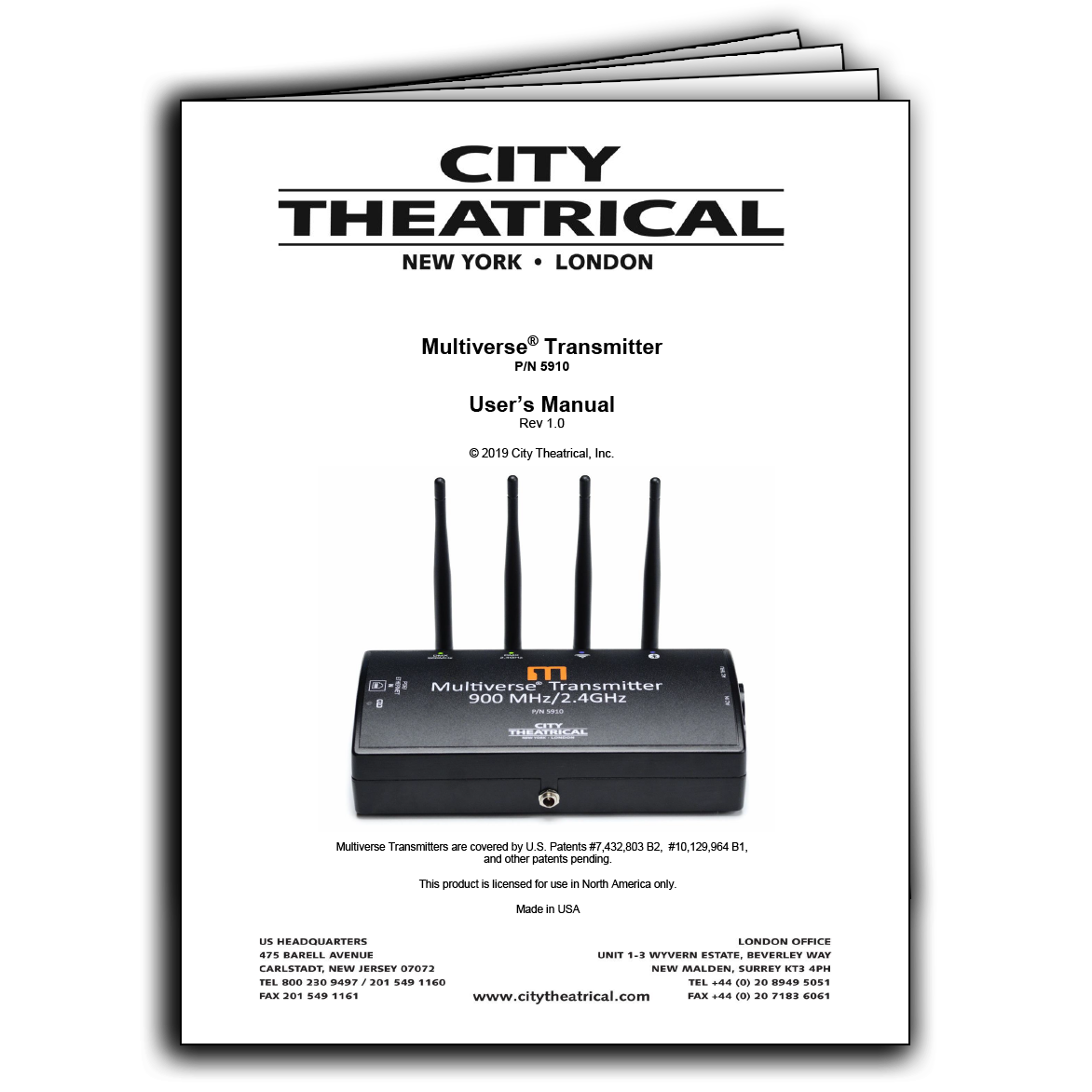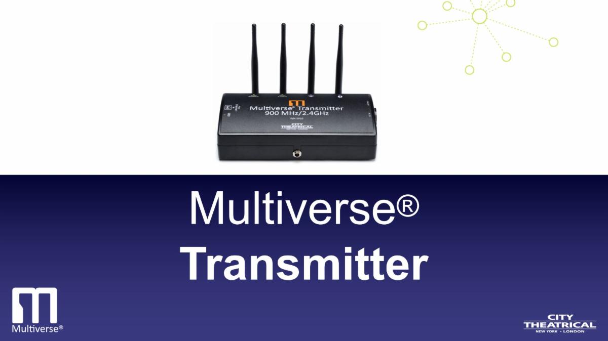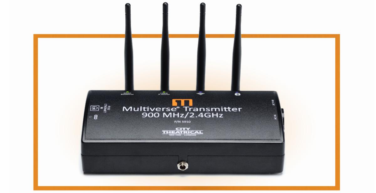 City Theatrical's Multiverse® Transmitter opens a new world in wireless DMX/RDM. Its Ethernet input allows it to take in Streaming ACN (sACN) or Art-Net and to transmit between eight and 10 user-selectable universes of DMX/RDM, depending on the Multiverse Transmitter used, with the ability to use less radio energy than a present day single universe wireless DMX transmitter.