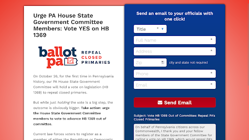 On Oct. 26, the House State Government Committee will, for the first time in history, hold a vote on legislation to repeal closed primaries. But while just holding the vote is a notable step the outcome is obviously bigger. Send an email urging committee members to vote to advance HB 1369 out of committee. Current law forces voters to register as a Republican or a Democrat to participate in primaries, even though all voters fund party primaries with their tax dollars. With roughly 1.3 million PA voters unfairly shut out of our primary process, it's time to repeal Pennsylvania’s closed primaries. Learn more.