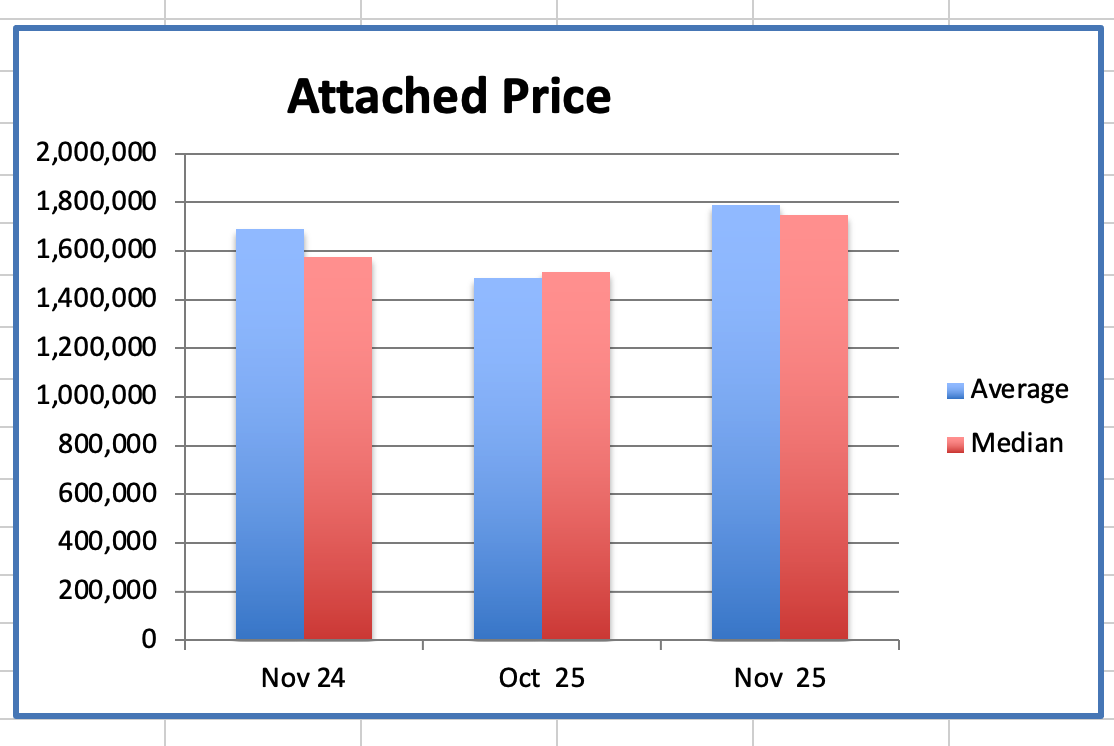 The Attached home average price was $1.79M, down 5% from $1.885M, the peak, in Dec 2024.