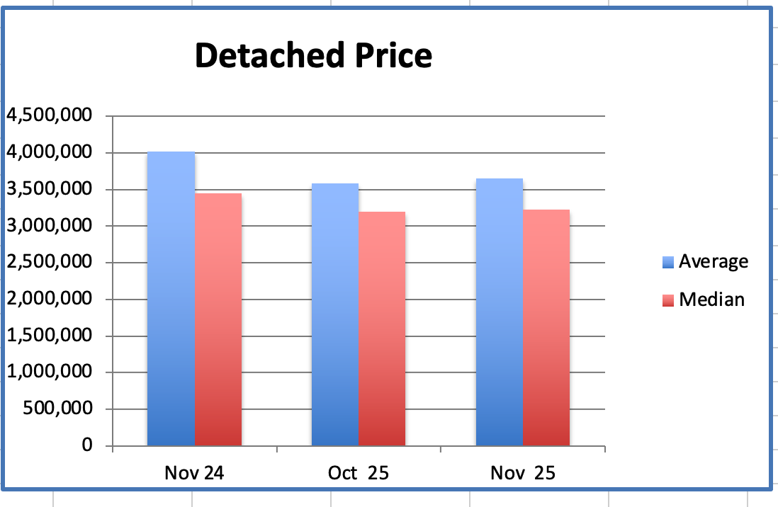 In November the Westside Detached Home average price was $3.654M, down 23% from $4.744M, the peak, in August 2023.