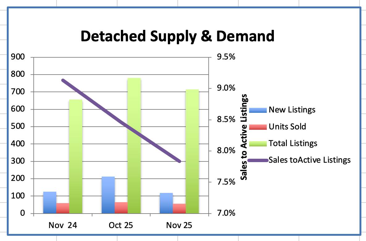 The total home supply in Metro Vancouver in November is up 14.4% year over year and that is 36.3% above the 10 year seasonal average while sales were down 15.4% from November 2024 and that is down 20.6% below the 10 year seasonal average.