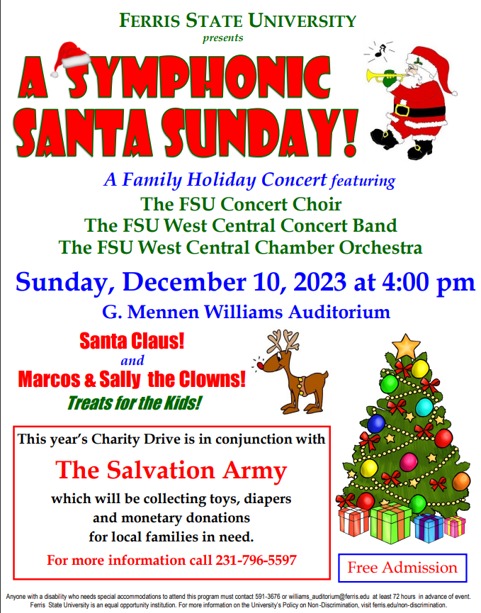 | Ferris State University presents: A Symphonic Santa Sunday! | Sunday, December 10th at 4:00pm at Williams Auditorium, you can enjoy A Symphonic Santa Sunday presented by Ferris State University! This family holiday concert will feature wonderful FSU choir, band and orchestra. Special appearance by Santa Claus, Marcos & Sally the Clowns along with treats for kids. There will also be a charity drive for The Salvation Army - Big Rapids, MI. and feel free to donate toys, diapers and/or money for local families in need. Free admission to the concert and for any questions, please call 231-796-5597. | |