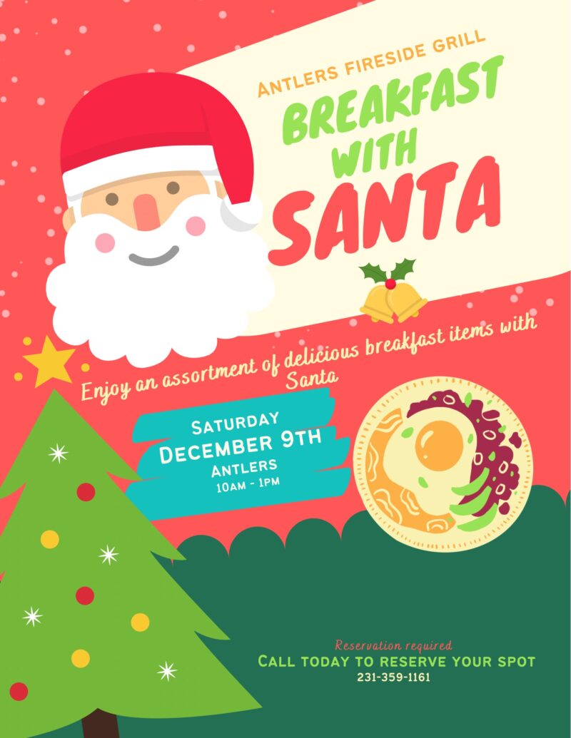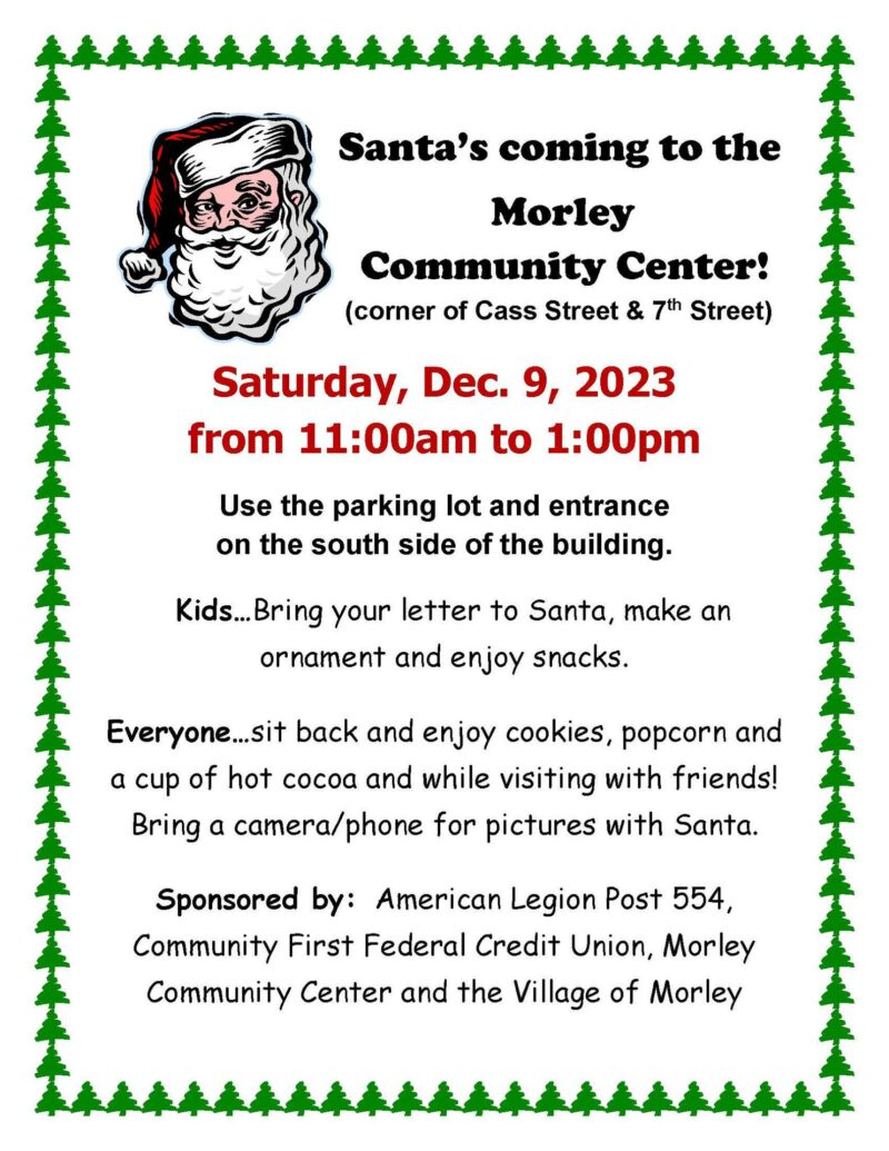 | Tell the kids Santa is coming to town! December 9th from 10am-1pm Santa will be in for breakfast at Antlers Fireside Grill in Canadian Lakes. Call to reserve your spot 231-359-1161! | Santa's Coming to The Morley Community Center | |