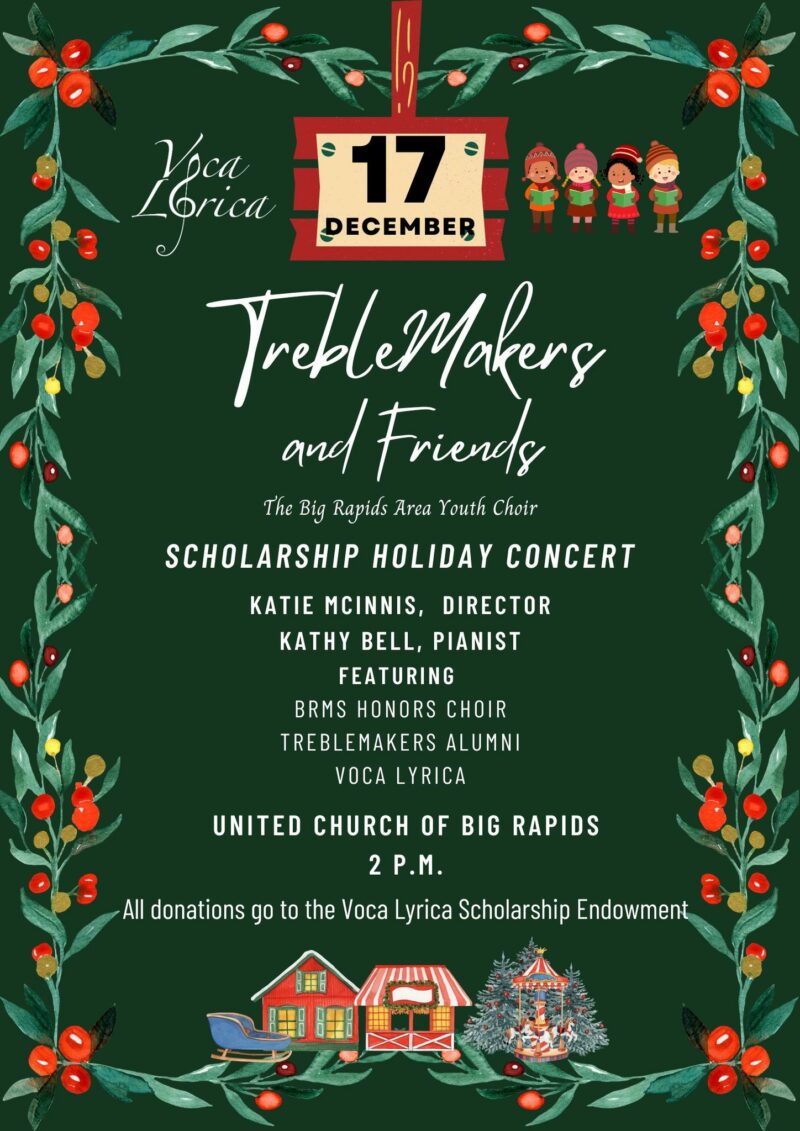 The TrebleMakers Youth Choir proudly presents its annual scholarship holiday concert. Come hear young voices filled with excitement and wonder at the joy of the season. Directed by Katie McInnis, the program will also feature the Big Rapids Middle School Honors Choir, TrebleMakers alumni, Voca Lyrica, and past Voca Lyrica youth scholarship winners.
