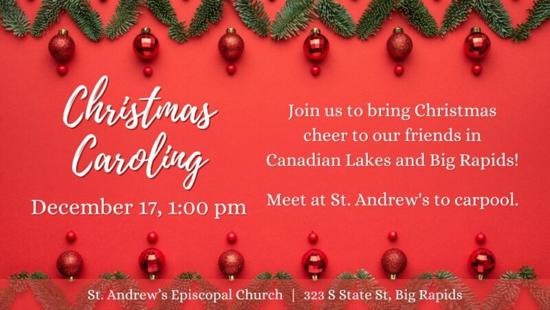 Join St. Andrew's to bring Christmas cheer to members of our parish throughout Canadian Lakes and Big Rapids. Meet in the parking lot at St. Andrew's, Big Rapids at 1pm to carpool. Songbooks will be provided.