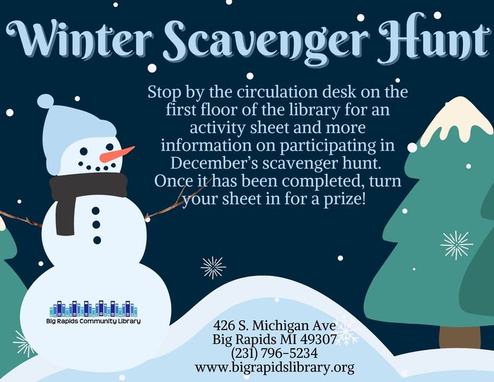 | Stop by the circulation desk on the first floor for an activity sheet and more information on December's scavenger hunt. Once it has been completed, turn your sheet in for a prize! | |