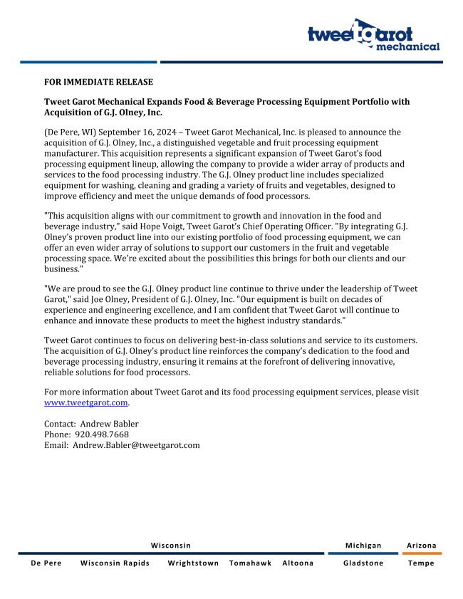 Tweet Garot Mechanical, Inc. Announces the acquisition of G.J. Olney, Inc., a Distinguished Vegetable and Fruit Processing Equipment Manufacturer.