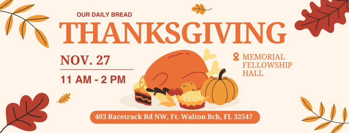 It’s that special time of year again! Our Daily Bread invites everyone to our Annual Thanksgiving Community Lunch on Thursday, November 27, from 11:00 a.m. to 2:00 p.m. in the Memorial Fellowship Hall.