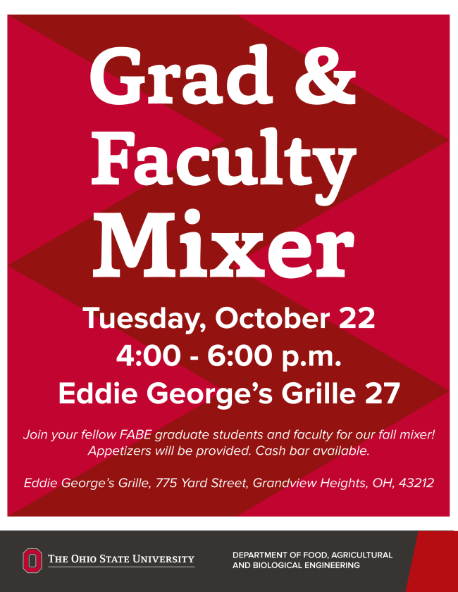 Join your fellow graduate students and faculty from FABE for our fall mixer. Appetizers will be provided, cash bar will be available.