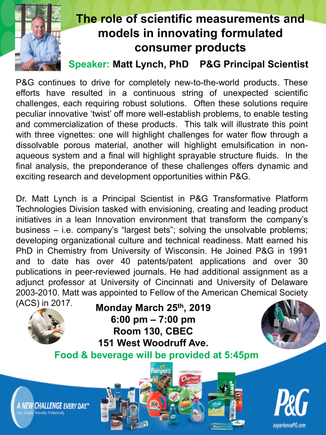 Seminar: The role of scientific measurements and models in innovating formulated consumer products by Matt Lynch, P&G Principal Scientist