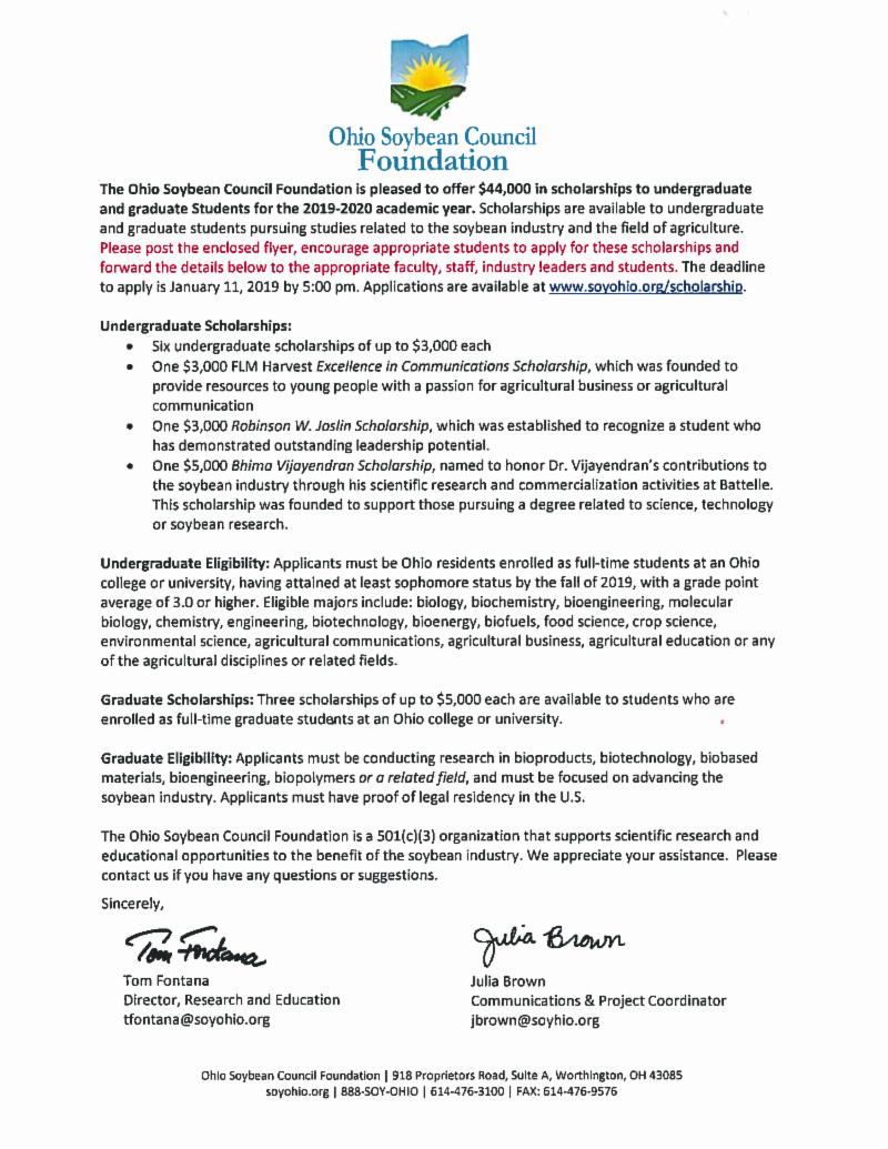 Each year, all students enrolled in the Department of Food, Agricultural and Biological Engineering are invited to submit an application for college level (CFAES) and department level (FABE) scholarships through the