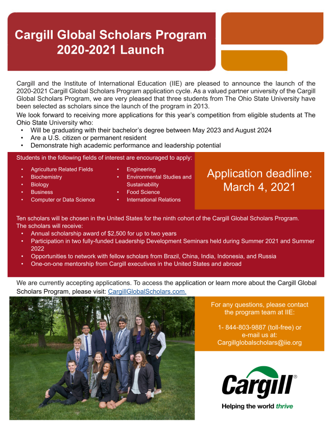 Undergraduate Eligibility: Applicants must be Ohio residents enrolled as full-time students at an Ohio college or university, having attained at least sophomore status by the fall of 2021, with a grade point average of 3.0 or higher. Eligible majors include biology, biochemistry, bioengineering, molecular biology, chemistry, engineering, biotechnology, bioenergy, biofuels, food science, crop science, environmental science, agricultural communications, agricultural business, agricultural education or any of the agricultural disciplines or related fields.