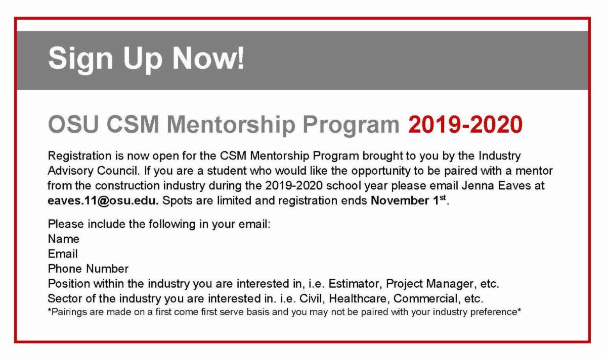 Registration is now open for the CSM Mentorship Program brought to you by the Industry Advisory Council. If you are a student who would like the opportunity to be paired with a mentor from the construction industry during the 2019-2020 school year please email Jenna Eaves at